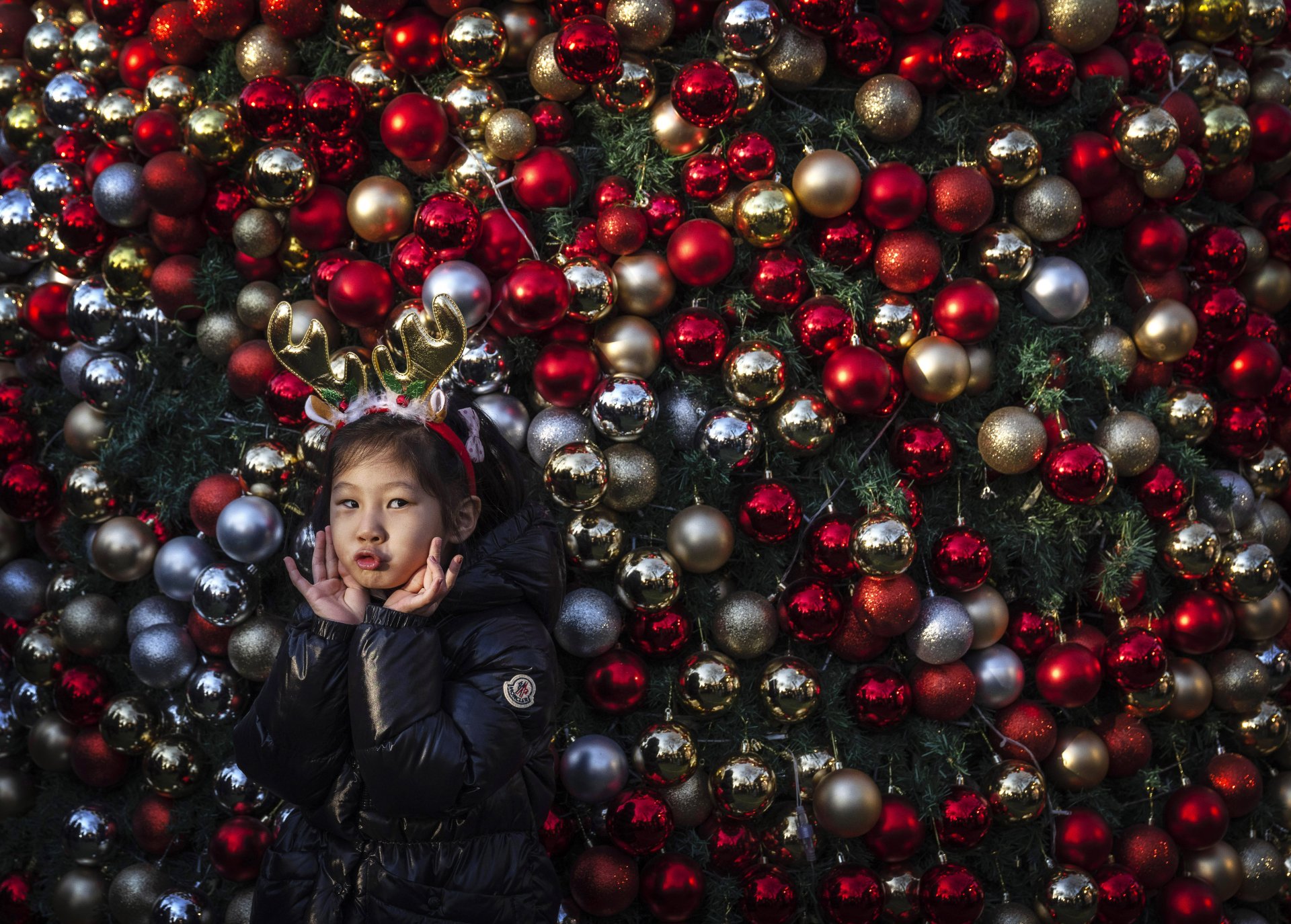 ПЕКИН, КИТАЙ – 21 ДЕКЕМВРИ: Момиче прави забавна физиономия, докато носи празнична украса на главата си, позирайки пред коледна елха, украсена с орнаменти на френския коледен пазар на 21 декември 2025 г. в Пекин, Китай.