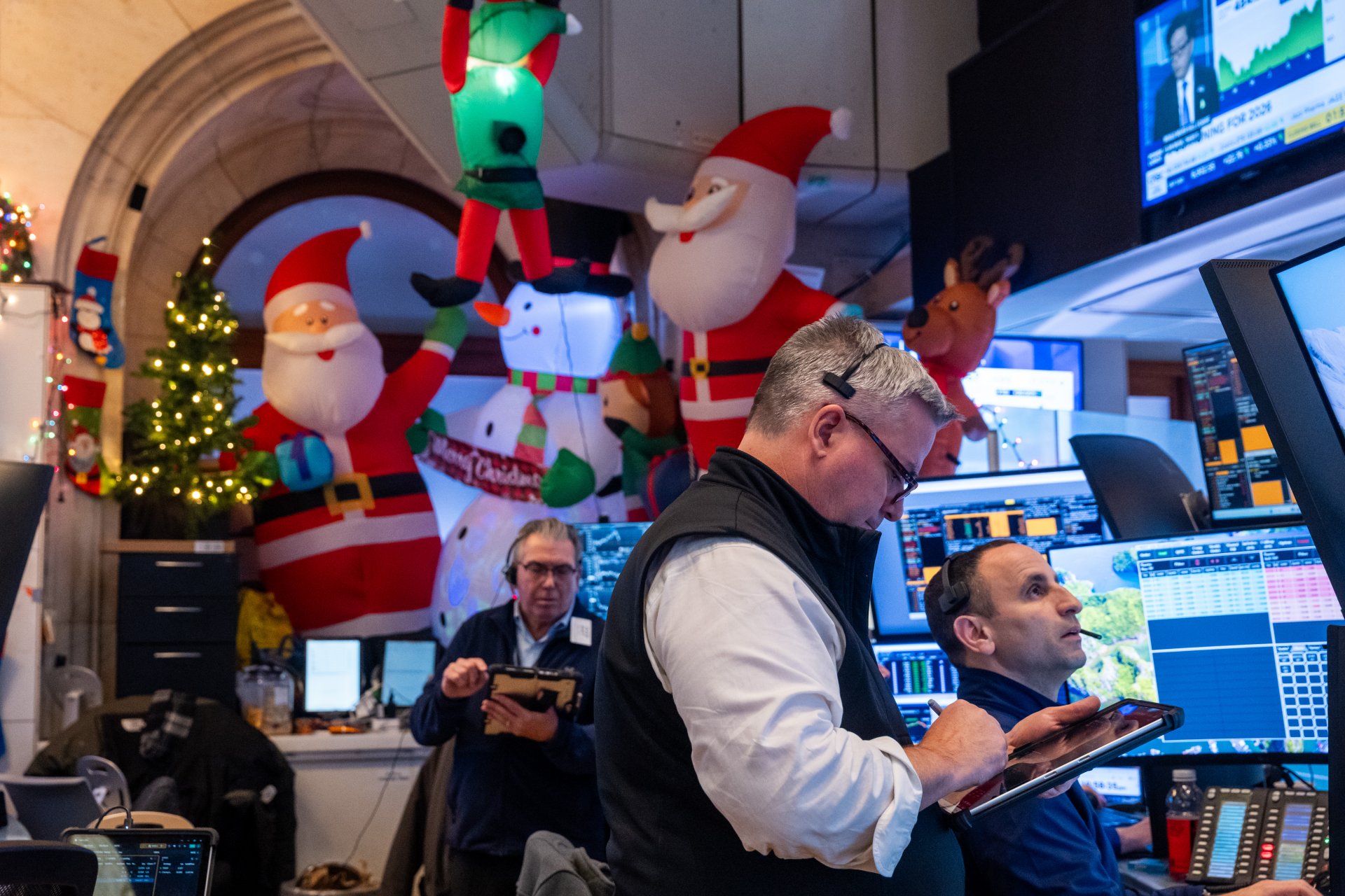НЮ ЙОРК, САЩ - 24 ДЕКЕМВРИ: Трейдъри работят на пода на Нюйоркската фондова борса (NYSE) по време на съкратен търговски ден преди коледните празници на 24 декември 2025 г. Индексът Dow завърши с ръст от почти 300 пункта след позитивни икономически данни, което показва стабилност на американската икономика.