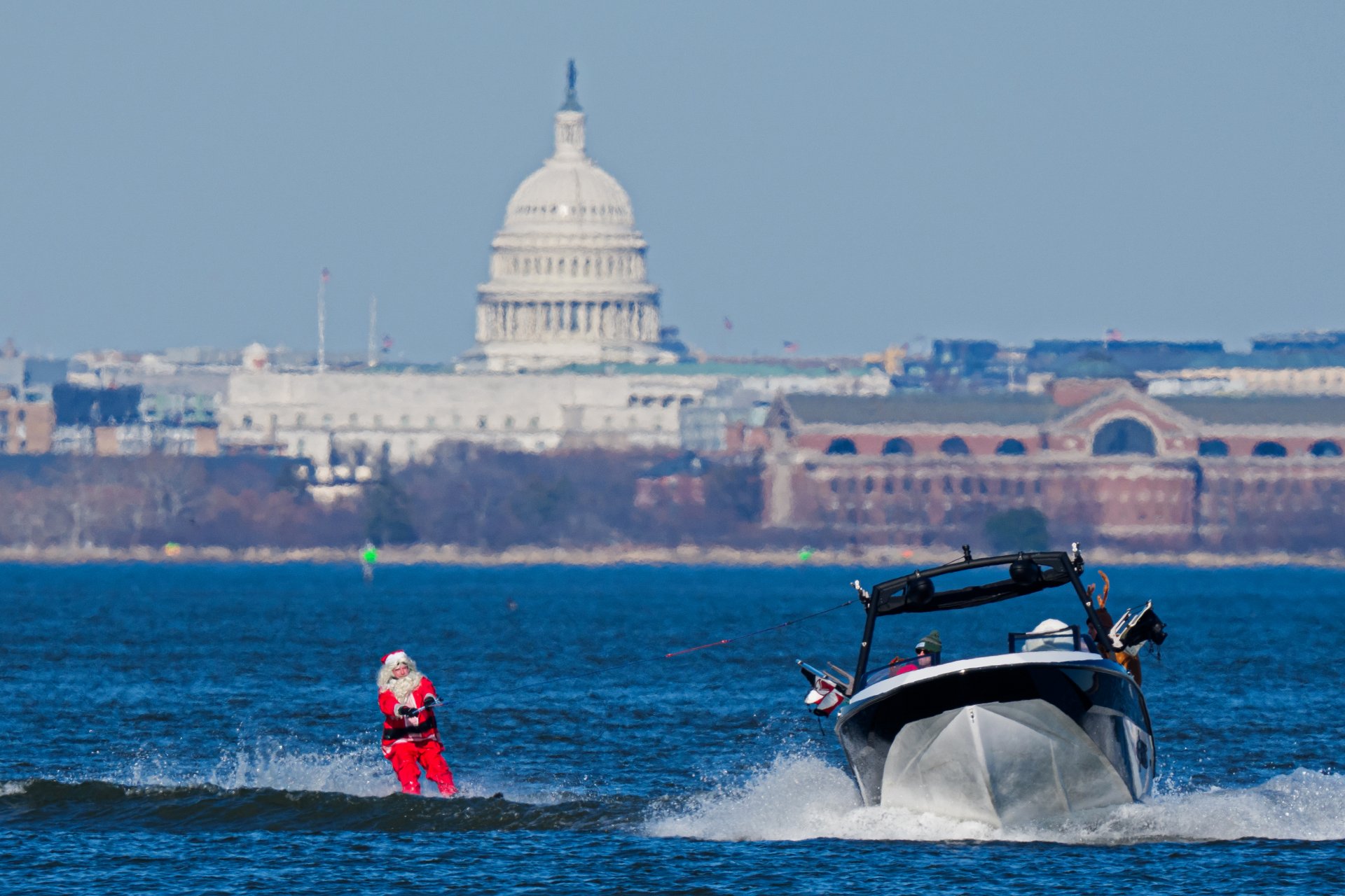 АЛЕКСАНДРИЯ, ВИРДЖИНИЯ - 24 ДЕКЕМВРИ: Човек, облечен като Дядо Коледа, участва в събитието "Санта на водни ски" на 24 декември 2025 г. в Александрия, Вирджиния. Дядо Коледа и неговите елфи се изправиха срещу Гринч по време на ежегодното водно шоу на река Потомак.