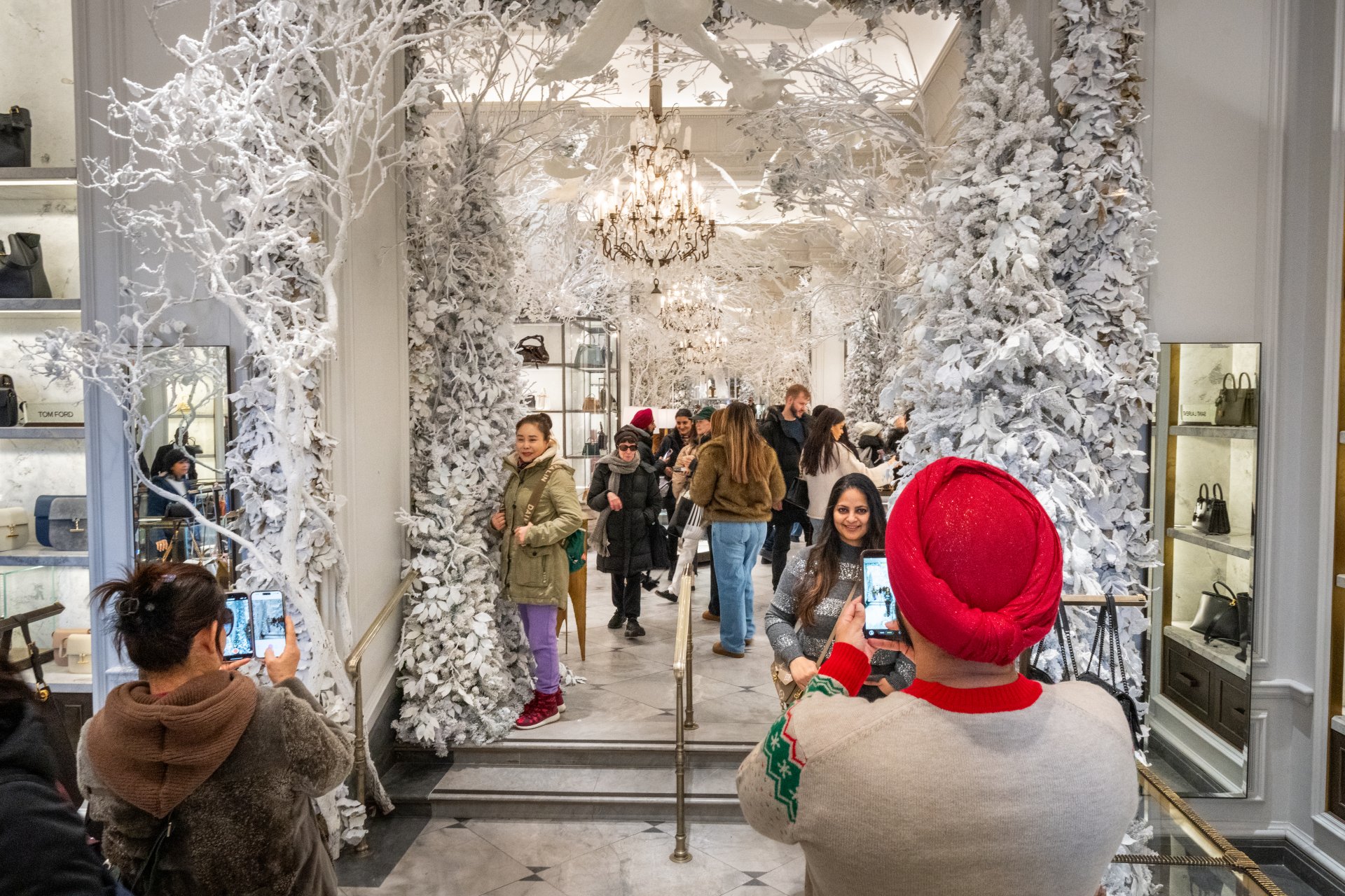 НЮ ЙОРК, САЩ - 24 ДЕКЕМВРИ: Пазаруващи се снимат в магазина Бергдорф Гудман на 24 декември 2025 г. в Ню Йорк. Магазинът, както повечето луксозни търговци по 57-а улица, е украсен празнично.