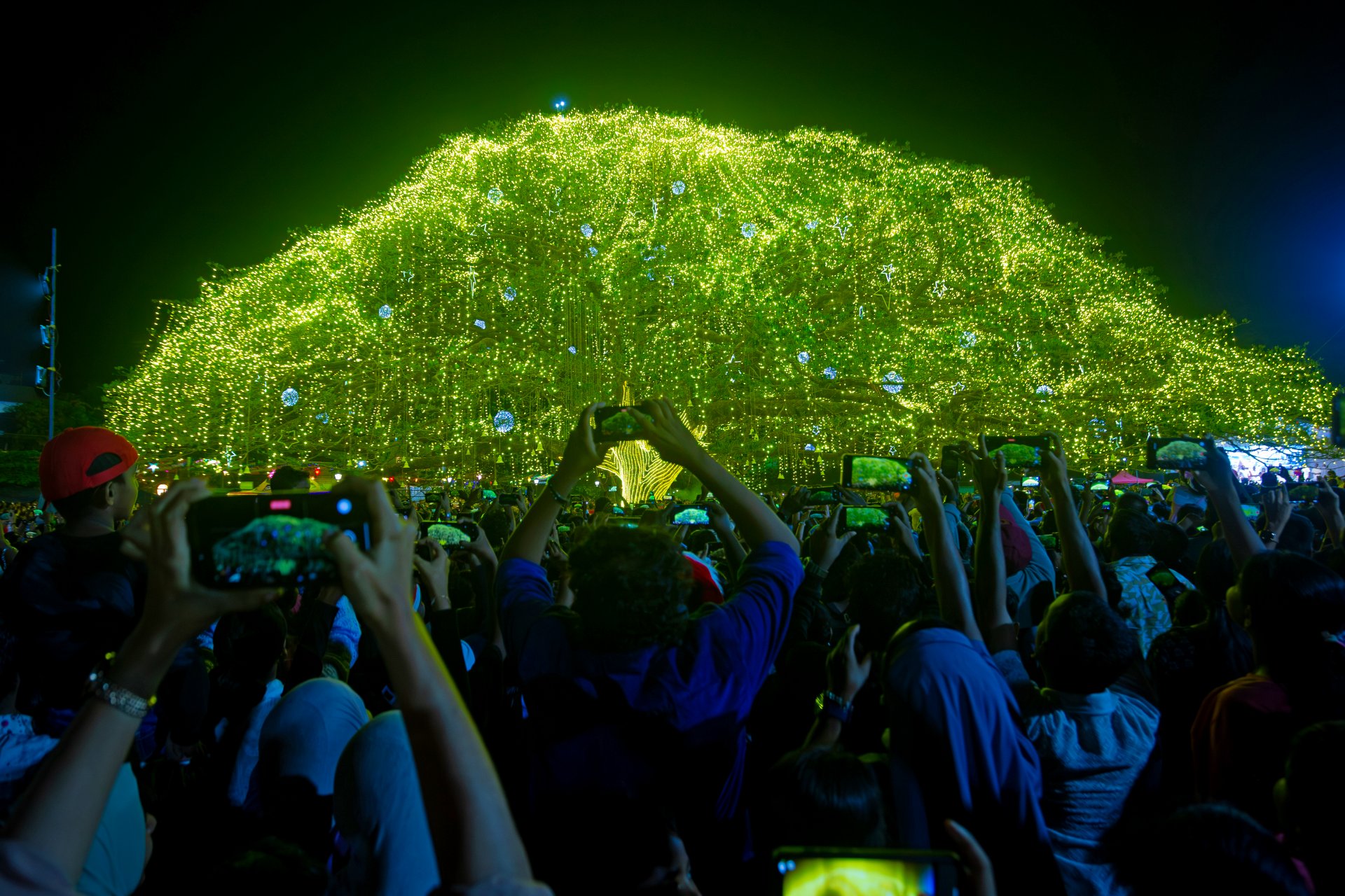 КОЧИ, ИНДИЯ - 25 ДЕКЕМВРИ: Хора се снимат пред осветена елха в парк на Коледа, 25 декември 2025 г. в Кочи, Индия. Християните по света отбелязват празника с литургии и тържества.